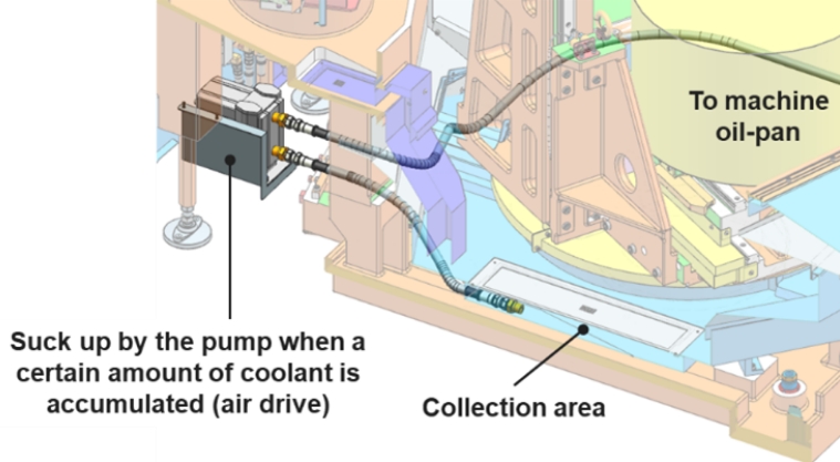 Chips and coolant inside the PC7 are collected in one place, and the accumulated coolant is automatically discharged into the machine.