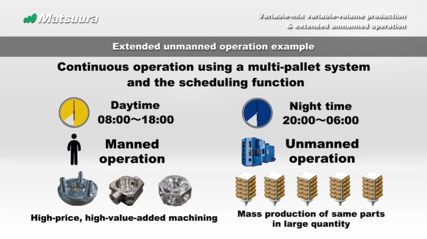 Installing ATC tool magazines and APC pallet systems as options with Matsuura 5-axis machining centers allows the machines to automatically continue production without human intervention, even during the night.