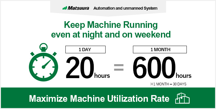 Matsuura’s original automation and unmanned running systems can provide a solution to labor shortages by using working hours effectively. These systems can be installed as an option for Matsuura’s 3-axis/5-axis machining centers to automate tool changes and pallet changes using programs, drastically improving the productivity in your workshop.