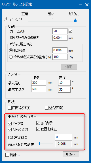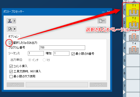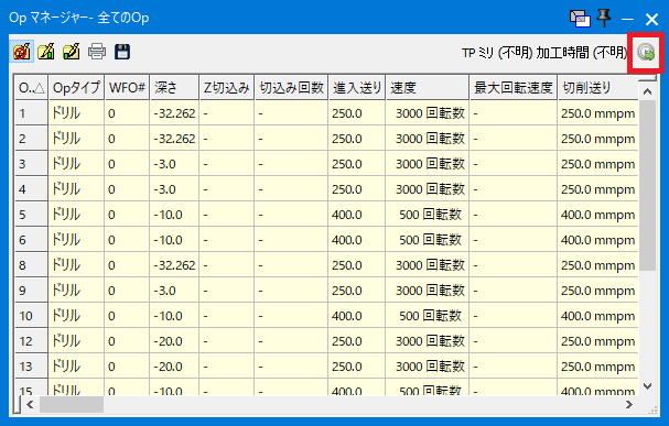 Opマネージャーウィンドウが開くので、ウィンドウ上部のボタンをクリックすると、TPミリ(加工長)と加工時間が表示されます。この表示はオペレーションを増やしたり、ファイルを開きなおすたびに(不明)となるため、再度ボタンを押す必要があります。