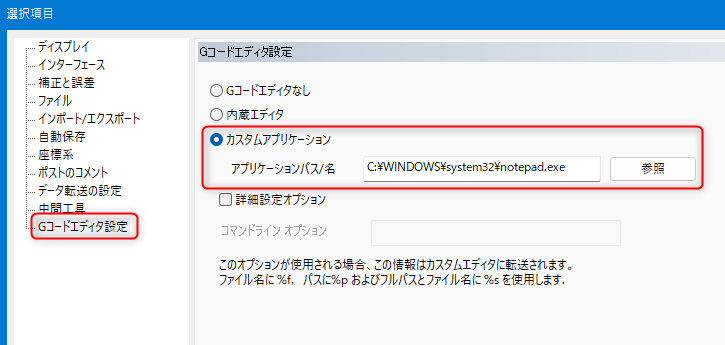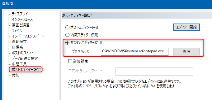 画面上部のメニュー、「ファイル」「選択項目」の「ポストエディター設定」から「カスタムエディター使用」に切替えてください。メモ帳で表示したいときは、プログラム名をNotepad.exeにします。任意のエディタを開きたい場合は、起動するエディタソフトの実行ファイルを指示します。