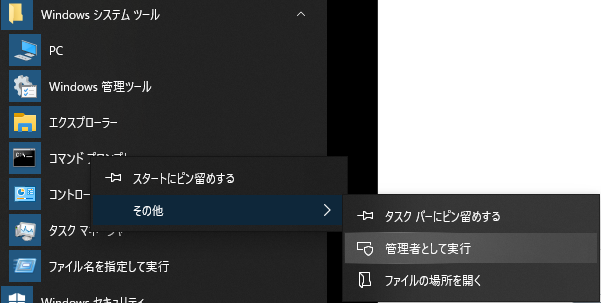 ② PCの管理者権限(Adminatrator)としてコマンドプロンプトを起動します。