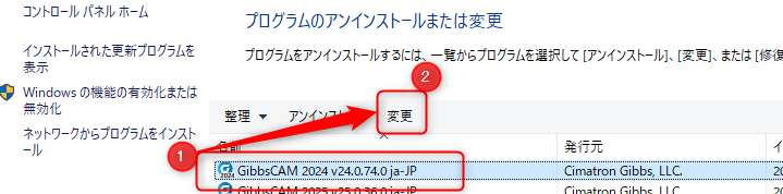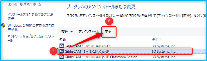 この問題は、コントロールパネル > プログラム > プログラムと機能でインストールを修復することで解決できます。 GibbsCAMを右クリックし、変更を選択してください。