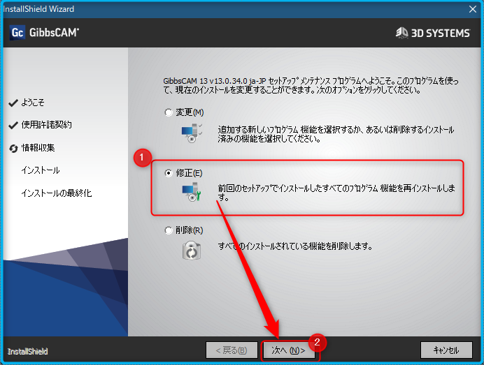 ⑥ 引き続きインストールプログラムを起動し、GibbsCAMを再インストールして下さい