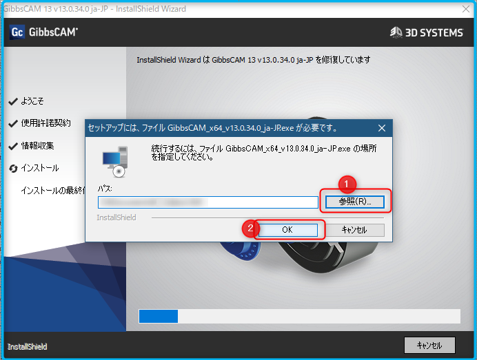 セットアップファイルの保存場所確認が表示されましたら、GibbsCAMのインストールプログラム(GibbsCAM_x64_v13.*.*_ja-JP.exe)の保存されているフォルダを「参照」ボタンをクリックして表示される画面で指定を行います。次いで「OK」をクリックします。