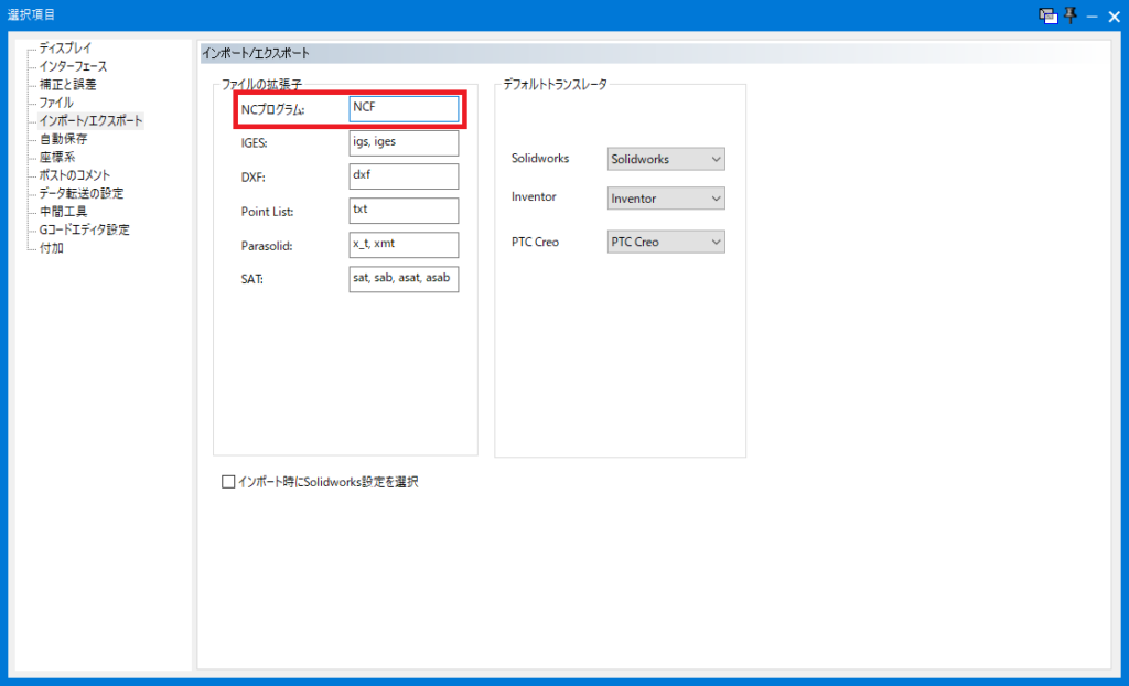 NCプログラムの拡張子を変更するには、画面上部メニューの「ファイル」「選択項目」の「インポート/エクスポート」から「ファイルの拡張子」のNCプログラムを変更する必要があります。入力ボックスに任意の拡張子を入力ください。
