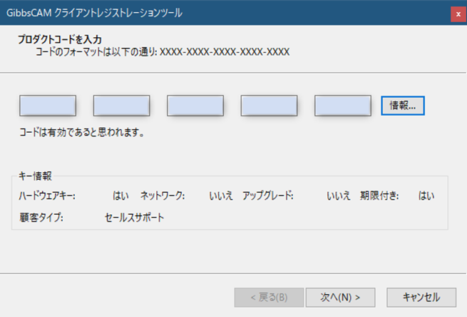 用意しておいたプロダクトコードを入力「次へ」をクリックします。(1枠4文字、全部で20文字)