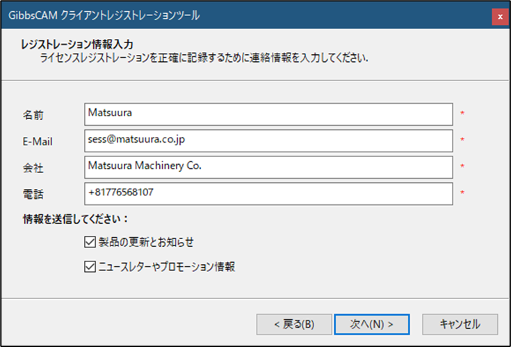 レジストレーション情報入力:名前(御担当者名)/E-mail/会社(御社名)