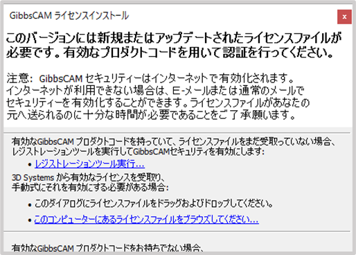 GibbsCAMを起動後、続けてGibbsCAMライセンスインストールが起動しますので、「このコンピューターにあるライセンスファイルをブラウズしてください…」をクリックします。
