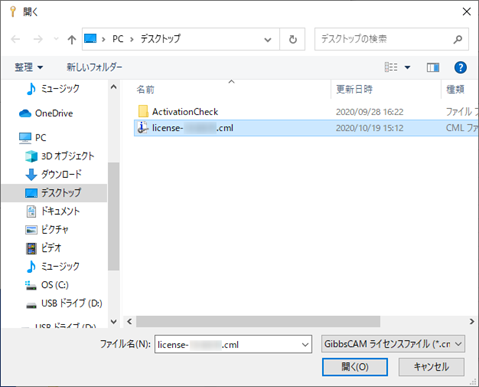 ファイル選択画面で受け取ったライセンスファイルの保存場所を開き、ライセンスファイルを選択して