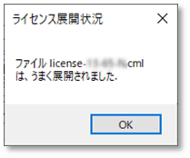 ライセンス認証が成功し、ライセンスファイルが登録されると右図メッセージが表示されます。