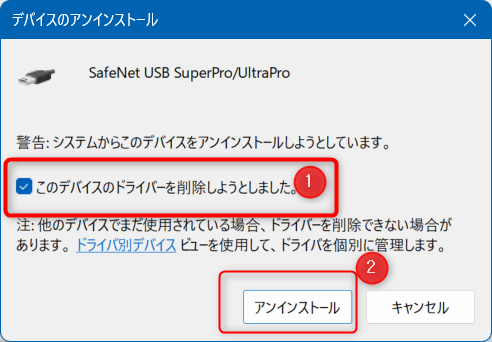 4.次にデバイスの「アンインストール」画面から「?このデバイスのドライバーを削除しようとしました」のチェックをONにして、「アンインストール」を実行。