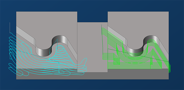 加工幅を維持し工具の過負荷を防止する為に、曲線と円弧を利用した加工パスを作成します。