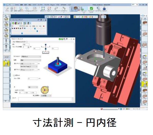 GibbsCAMのプロービング機能なら、機内計測用の加工原点計測パス、寸法計測パスの作成や、計測後の追い込み加工等の加工判定設定ができます。