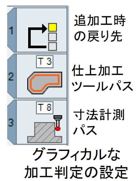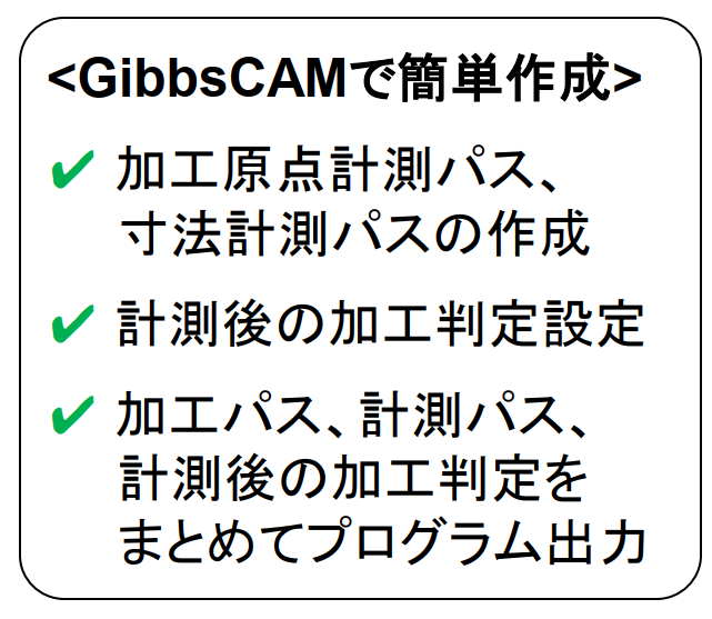 その為、GibbsCAM内で加工パス、計測パス、計測後の加工判定設定をまとめてプログラム出力ができます。