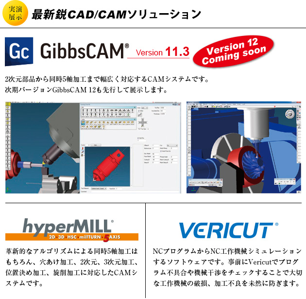 また、マツウラ独自開発LUMEX 専用CAM「LUMEX CAM」や、簡単操作で2軸から同時5軸まで対応可能なCAMシステム「GibbsCAM」をはじめとするCAD/CAM システムも同時展示いたします。