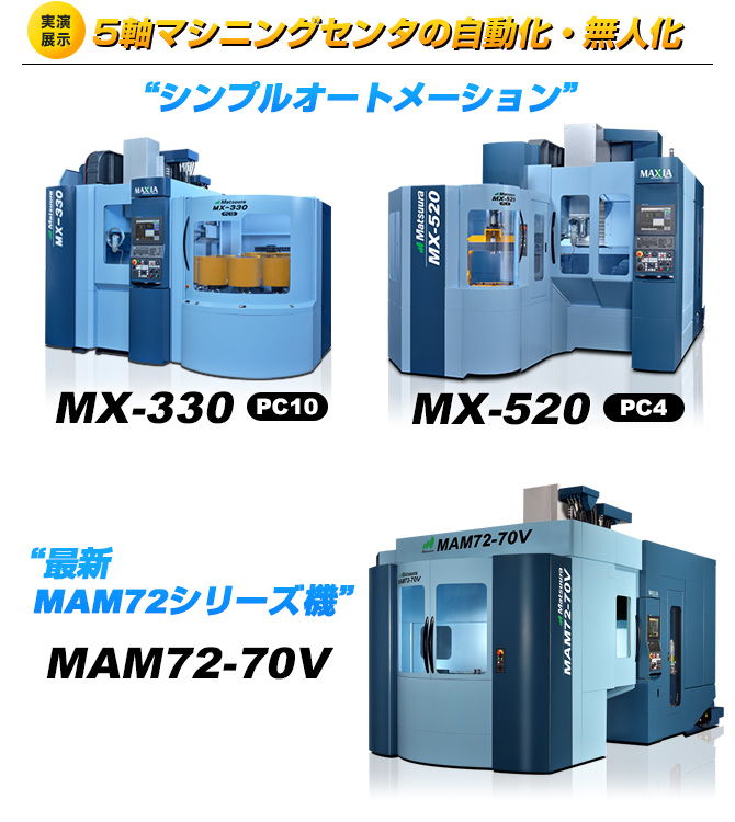 “5軸マシニングセンタの自動化・無人化”をテーマに、「MX-330 PC10」、「MX-520 PC4」、「MAM72-70V」を展示し、“シンプルオートメーション”“最新MAM72シリーズ機”をご紹介致します。また、第5世代ハイブリッド金属3Dプリンタ「LUMEX Avance-25」、大型化・高速化・自動化「LUMEX Avance-60」などマツウラの最新イノベーションも展示致します。