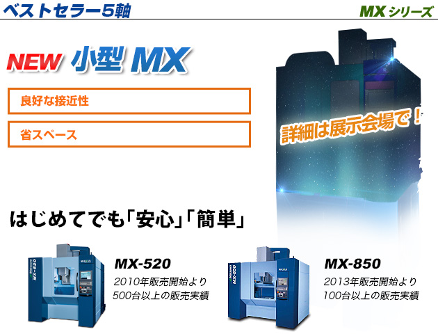 5軸のベストセラー“5軸へのステップアップ”MXシリーズの新型「小型 MX」(7月リリース)、 最新のモノづくり“ハイブリッド金属3Dプリンタ”の新型「大型 LUMEX」(6月リリース)をお披露目させて頂きます。
