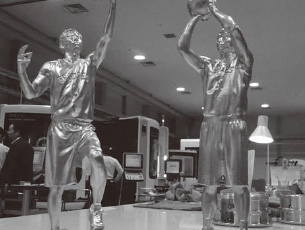 同社は、富山県のプロバスケットボールチーム「富山グラウジーズ」のオフィシャルユニフォームパートナーになっています。取材をした応接室には、同社名がプリントされた真赤なユニフォームが飾られていました。また選手2人を3Dレーザー測定器で全身をスキャンして、5軸マシニングセンタで削ったトロフィーをチームに寄贈しています。