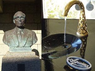 事務所前には、創業者田中英行氏の銅像があり、またロ ビーにはハイブリッド金属3Dプリンタで作られた水が流 れているモニュメントが置かれています。創業の歴史を大 事にしながら最新技術に挑戦する社風を感じました。
