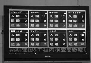 同社では、益々多品種少量生産が進み、納期短縮と納期管理が課題でした。吉本社長は以前ソフトウェア関連の会社で勤務経験もあり様々な生産管理ソフトを検討しましたが、納得出来るシステムがなく、独自の「ルート管理システム」を開発し運用しています。工場内をブロック(マシニング、大型MC,横型MC等)分けし、ブロックごとの進捗状況を管理しています。大型ディスプレイを工場内壁面に設置し、従業員が何時でも進捗状況を認識できます。表示は“入図”(受けた仕事数)、“間際”(納期が迫っている仕事数)、“超過”(納期が過ぎている仕事数)の三つで管理しています。この工程管理システムにより、余裕のあるブロックの社員が忙しいブロックを手伝うことによる納期短縮の実現と、加工の進捗状況を営業部門が常に把握できるので発注や納期などの問い合わせに的確に回答ができるようになっています。詳細工程の管理は各グループ内で行い、自主性を持たせています。「細かい工程管理は各自に任せています。朝出社して図面を渡され仕事と機械が決まることも良くあります。どんな加工でも社員は責任を持って取組んでいます。このことで社員の多能工化が進んでおり、担当者が治具から加工方法まで考える技術力を持っています」と吉本社長