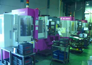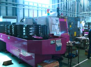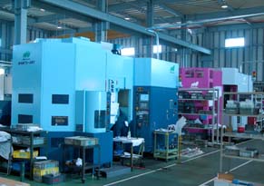 平成7年9月に赤紫色の11面パレット付き横形マシニングセンタ「MAM500HF PC11」3台と5軸制御立形マシニングセンタ「MAM72 S40」を設備。