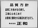 同工場の正面に掲げられている「品質こそ我社の誇り。工程に心を込めて、お客様に信頼される製品を送り出そう。 株式会社 正和」の品質方針。