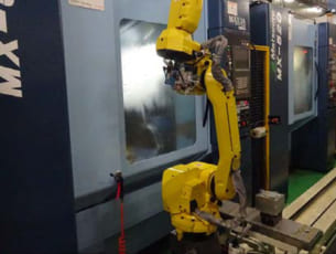 平成27年にデンマークのユニバーサルロボット社の認定 システムインテグレータに登録されています。自動化の主役 であるロボットはロボットメーカーから購入し、システム アップは同社が担当します。様々なワーク品種に対応したシ ステムの開発が特徴になっています。工場では、旋盤のワー ク交換を自動で行うマルチローダーシステム、小型マシニン グセンタ用のパレットローダシステムなどが実稼働していま す。マツウラの2台のMX-520と他社のマシニングセンタが 1台で構成された加工ラインでは、加工が終わるとロボット が人と同じ動作でドアを開けワークを交換します。そしてド アを閉めてサイクルスタートボタンを押して自動運転を起動 しています。古い機械でもロボットを使って自動化できるこ とを実証し、同社工場はショールームとなっています。