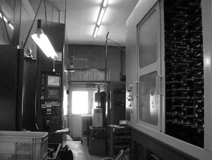 昭和55年11月に機械色が真赤なマツウラの立形マシニングセンタ「MC-500V1」を2台導入。セルフレームの加工をマシニングセンタで行ったのは同社が福井県内で初めてでした。この機械の加工プログラムを青山会長がDOSの