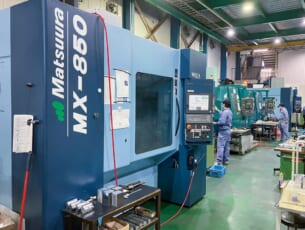 同社では現在、立形マシニングセンタMC-1000VF が2台、5軸制御立形マシニングセンタMX-520 が1台、MX-850 が2台、計5台のマツウラ機が活躍しており、主にアルミ加工品の多品種少ロット生産に役立てられています。同社とマツウラのお付き合いは1989年に設備した立形マシニングセンタMC-510V から始まりました。当時のエピソードを安井部長に伺いました。「MC-510V は私が入社して最初に扱った機械です。また私にとっては初めて触れるマシニングセンタでもありました。そのため、使用感について深く言及することは難しいですが、マシニングセンタという機械に対して、自動で動いて綺麗なモノを加工できる、率直に面白い機械だと感動したことを記憶しています」その後、同社ではFX-5 を1 台、MC-1000VF を2台と立形マシニングセンタを増設します。「高速回転主軸を備えるマツウラ機は、当社の得意とするアルミ加工との親和性が非常に高いです。MC-510V での実績もあり、立形の増設を検討する際は自然とマツウラ機を選択するようになりました」と広崎常務。