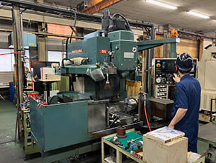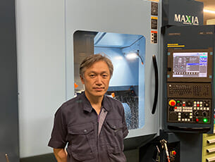 難易度の高い部品加工で多くの実績を持つ同社では、長年マツウラ製品を愛用されています。これまでに通算12台のマシニングセンタと、3シートのGibbsCAM を設備してきました。マシニングセンタはそのうち8台が現役で稼働しており、最も古い機種は1981年に設備した立形マシニングセンタMC-760V1 です。「40年以上前の古い機械ですが精度も安定しており、今なお現役で活躍してくれています。MC-760V1 に裏打ちされた実績もあり、私のなかでマツウラ機は耐久性に優れているイメージが定着しています。精度の面でもマツウラであれば間違いないと感じています。」と奥田社長。MC-760V1 の設備以降も、同社ではマツウラの立形マシニングセンタを継続的に設備されます。「当社では旋盤加工したワークに、追加の穴あけや切削を行う用途でマシニングセンタを使用しています。従来は3軸機で充分対応できたのですが、取引の幅が広がるにつれて、割り出し加工が必要なワークが増えてきました。そのような背景から、2009年に設備した立形マシニングセンタV.Plus-1000 は、3軸機に回転傾斜軸を付加した特殊仕様としています。」と奥田社長。