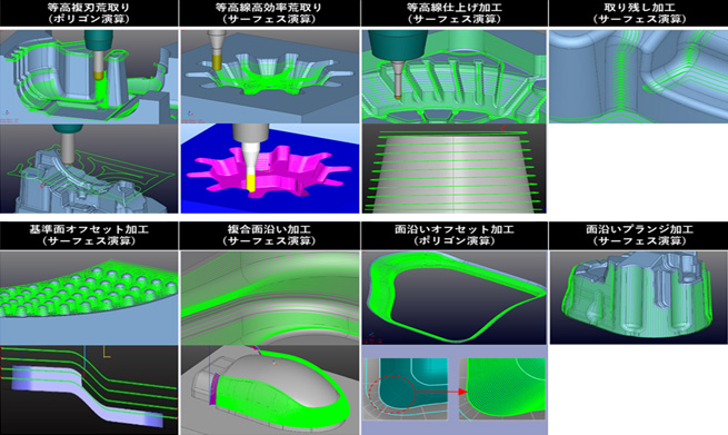 穴加工・同時2軸加工(等高線状の2.5次元加工)・同時3軸加工(面沿いなどの3次元加工)