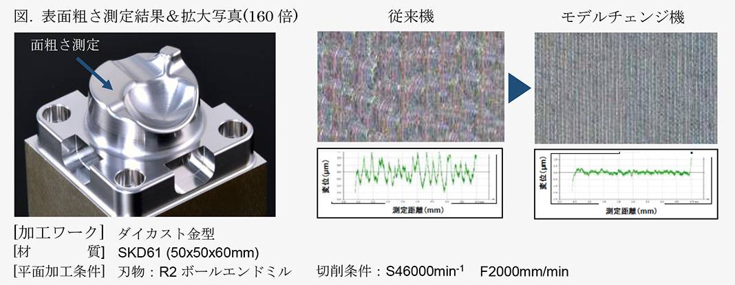 超精密加工を求める市場や、金型の磨きレスを求めるお客様向けに主軸を新規開発し、超高速領域での主軸振動を低減(従来比65%低減)することで、超高速領域での切削面の粗さでRa0.1μm*1以下を達成しました。また、新開発の低振動主軸は、工具回転振れを抑え小径工具の長寿命化に貢献します。