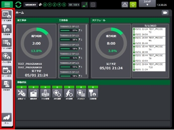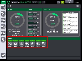 - 機械を実際に動かさなくても運転前に予定を組んだ加工が問題無く完了するか分かるようにするため、準備未完の段取りが一目でわかる機能(ホーム画面)を追加。