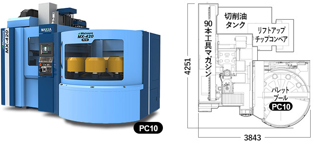 標準30本(ドラムマガジン)、オプション60本、90本(チェーンマガジン)の工具マガジンとPC10(フロアパレットシステム)による自動化パッケージ。省スペースでオートメーションシステムを構築できます。