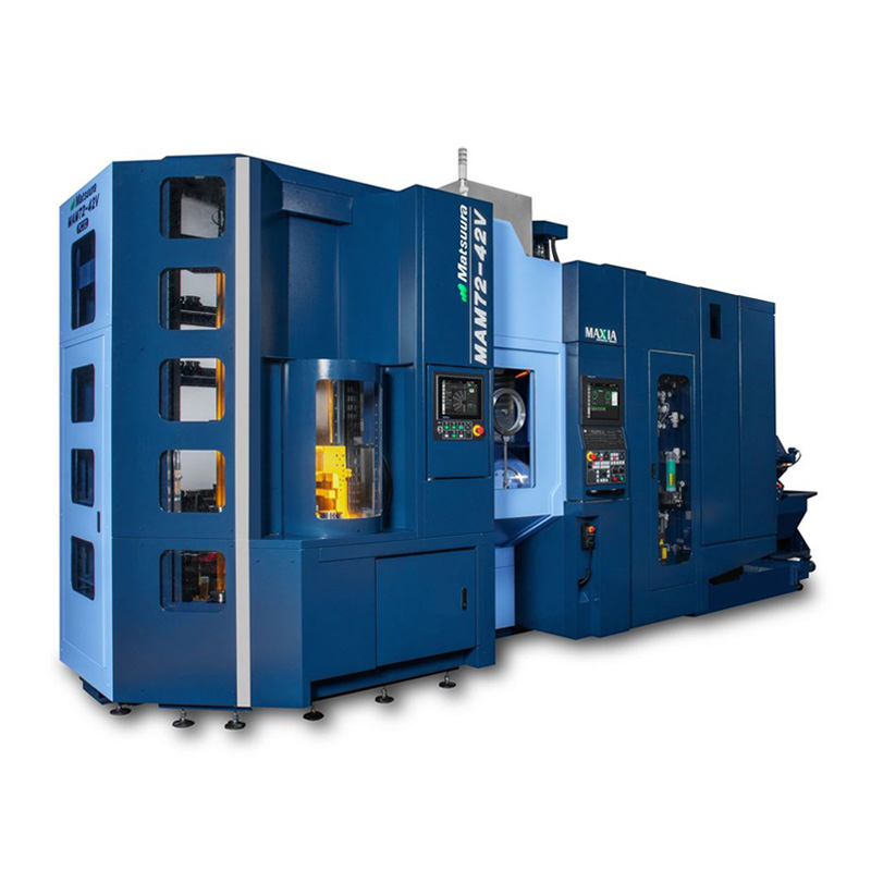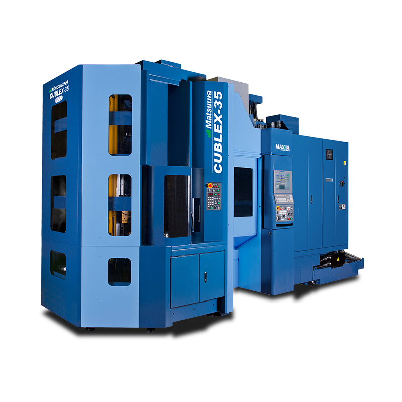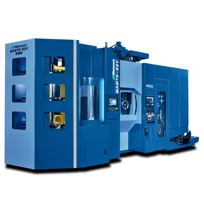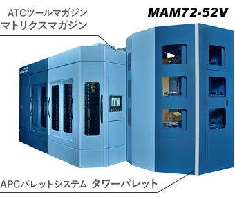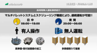 マツウラの製品である、5軸マシニングセンタにATCツールマガジンやAPCパレットシステムをオプションとして設置することで、人の手を使わず、夜間であっても機械が自動的に生産を継続してくれます。