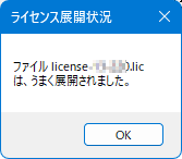 ライセンス認証が成功し、ライセンスファイルが登録されると右図メッセージが表示されます。