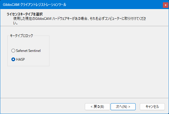 「ライセンスキータイプを選択」画面が表示されましたら、再度、ご使用になるGibbsCAMのハードキー(USBキー)を確認頂き、ご使用のハードキーと同じタイプのキータイプ選択後、レジストレーションツールの操作を進めてください。