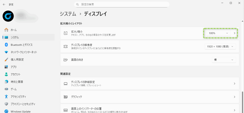 - [システム]→[ディスプレイ]を選択